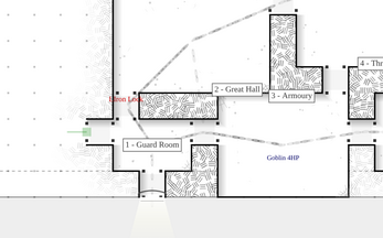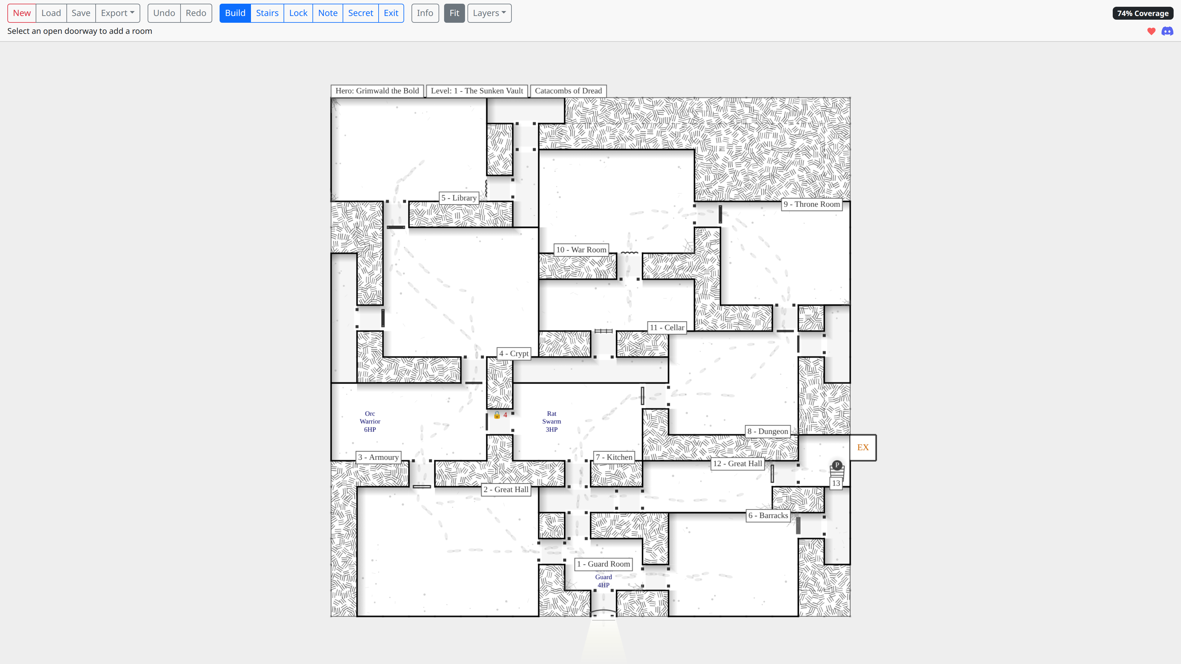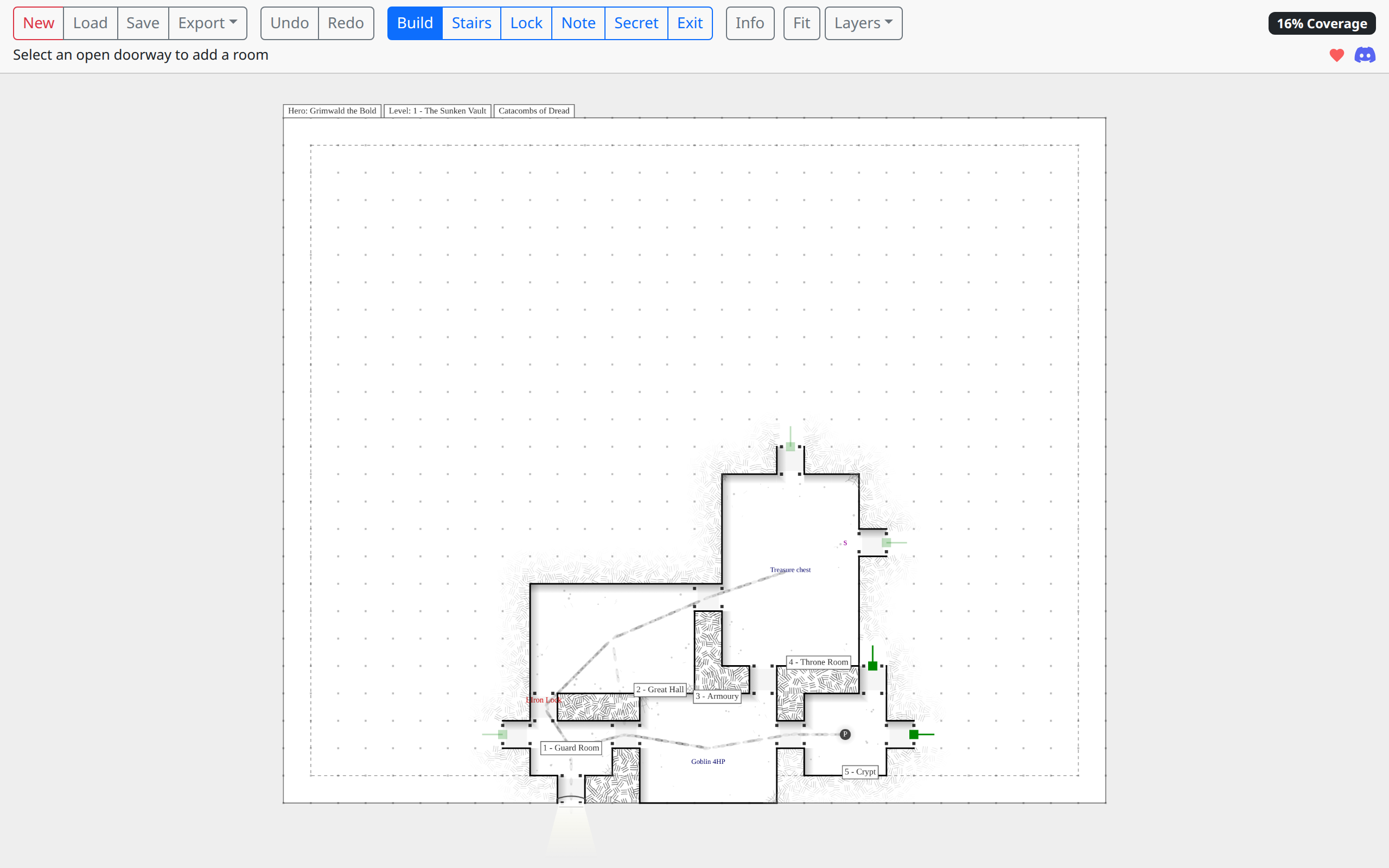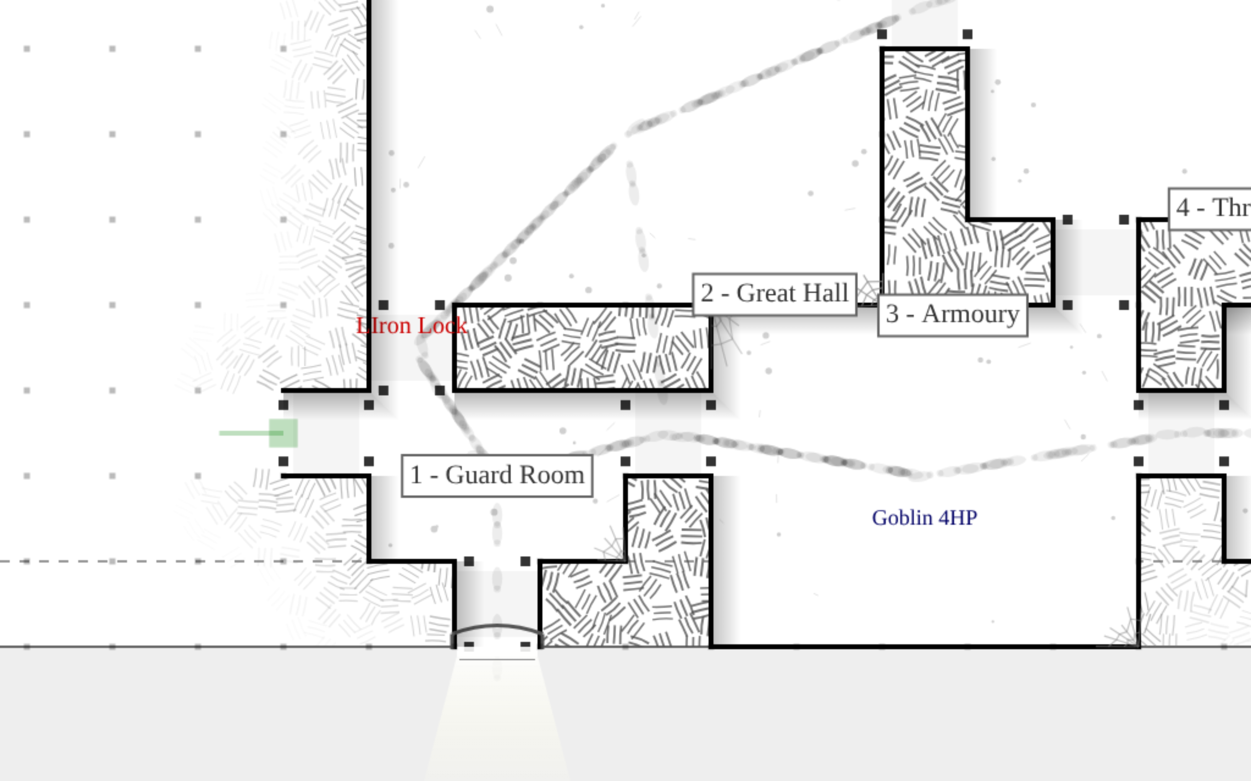 Build your dungeon map room by room as you play, with automatic wall shadows, cross-hatching, doorway symbols, and room labels. Track your position with an animated player token that leaves footprint trails through the dungeon.